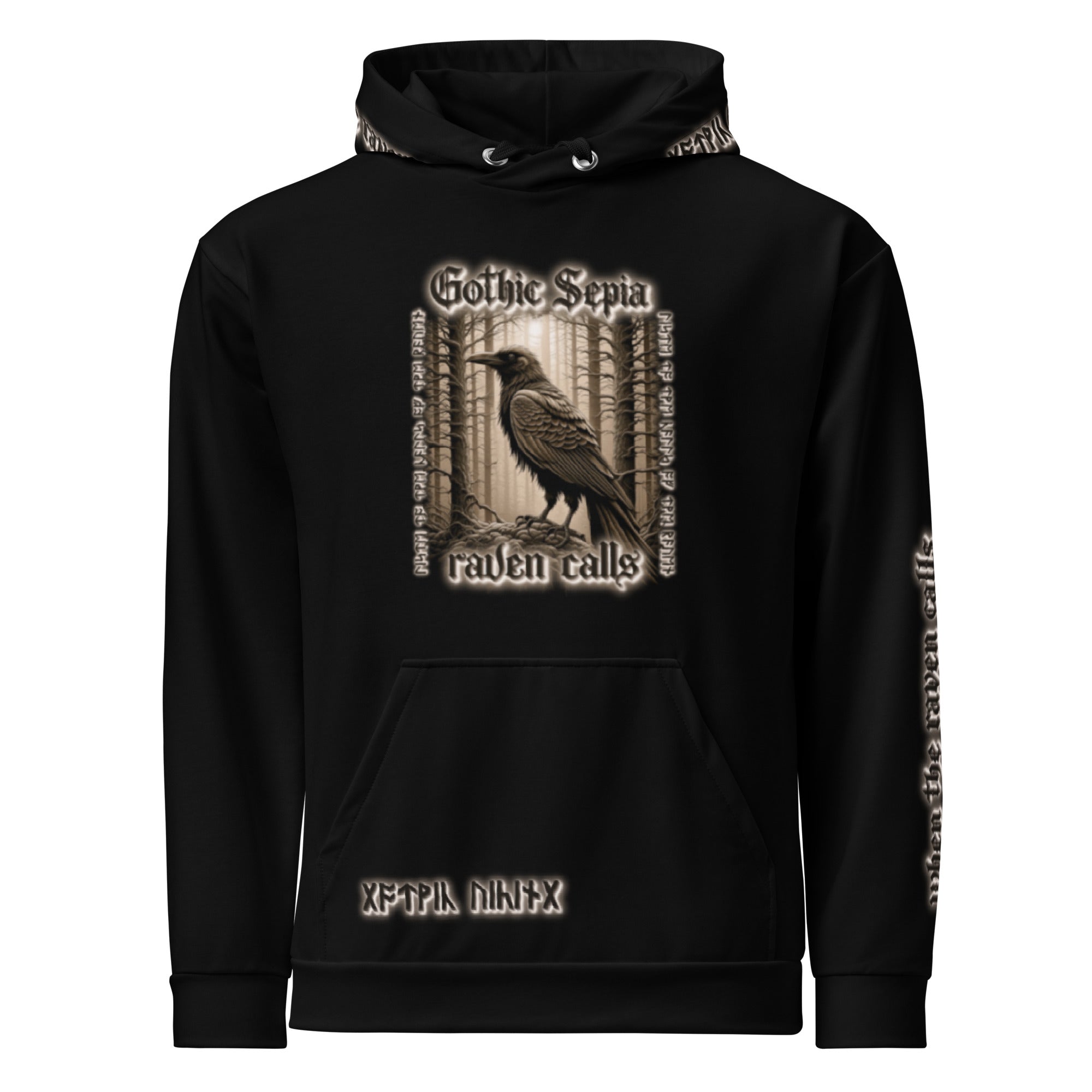 Gothic Sepia, Raven Calls, All over Print, Unisex cotton hoodie