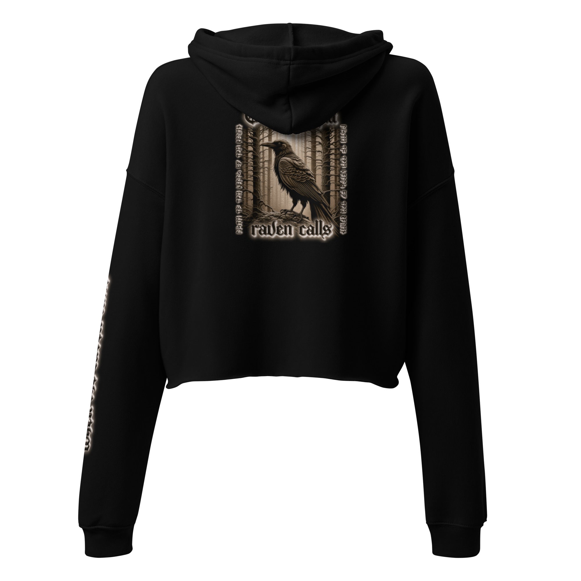 Gothic Sepia, Raven Calls, front / back / left sleeve design, Crop Hoodie